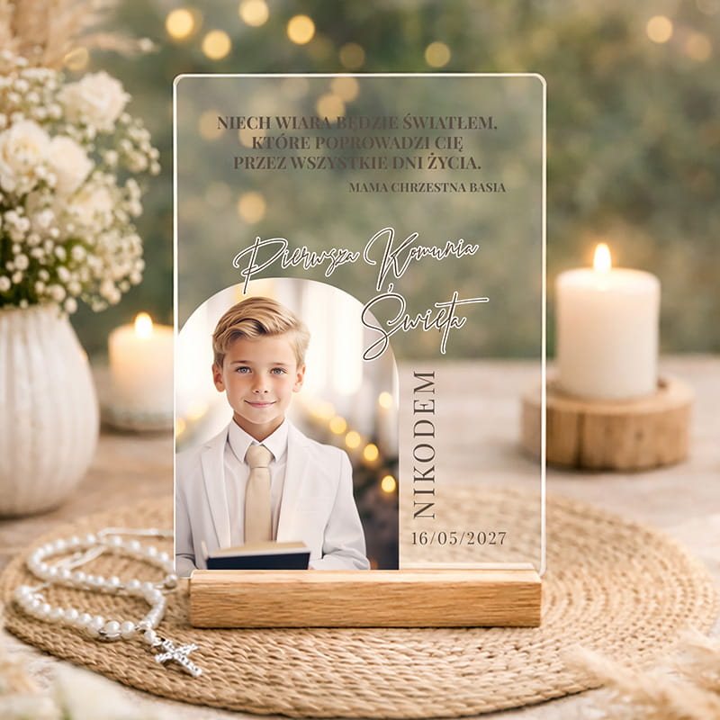 Personalizowana tabliczka akrylowa ze zdjęciem dziecka to elegancka pamiątka Pierwszej Komunii Świętej z imieniem, datą i dedykacją. Nowoczesna forma na drewnianej podstawce sprawdzi się jako dekoracja i wyjątkowy prezent.