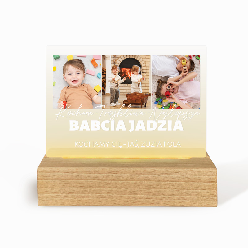 Personalizowana tabliczka akrylowa z podświetleniem i zdjęciami to nowoczesny prezent dla babci, dziadka lub dla obojga. Na przezroczystej tafli znajdują się wybrane fotografie, imię lub imiona oraz podpis wnuków. Całość podświetlana jest elegancką, drewnianą podstawką LED. To wyjątkowy prezent na Dzień Babci i Dziadka, który ozdobi każde wnętrze i będzie miłą pamiątką.