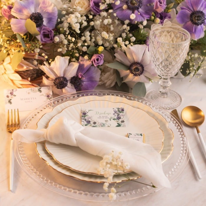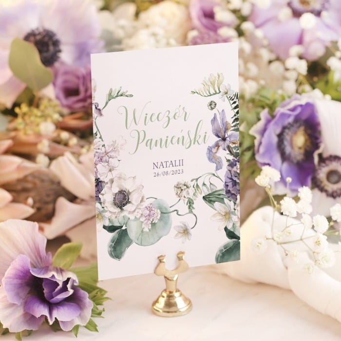 Aby stworzyć zjawiskową aranżację na wieczorze panieńskim, koniecznie zadbaj o spójne dekoracje i dodatki. Dzięki temu wystrój będzie harmonijny, a efekt z pewnością oczaruje przyszłą pannę młodą. Jeśli Twoim celem jest aranżacja kobieca i romantyczna, nie może zabraknąć kwiatów. Jeśli szukasz oryginalnych dodatków z motywem kwiatowym, ta tabliczka na stół z anemonami i irysami z pewnością przypadnie Ci do gustu. Tabliczkę możesz wykorzystać jako dekorację zarówno w przypadku przyjęcia organizowanego w domu, jak i w restauracji, gdzie dodatkowo przyjmie funkcję tabliczki rezerwacyjnej.