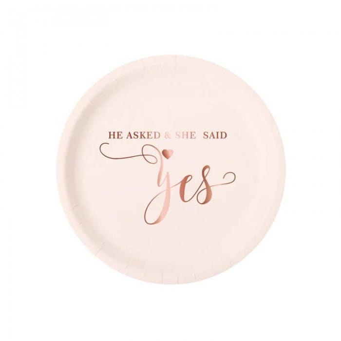- Talerzyki dostępne w naszym sklepie internetowym są ze wzmocnionej tektury. Dzięki temu doskonale sprawdzą się zarówno do serwowania dań zimnych, jak i gorących. Istotnym elementem, jest ich wzór nawiązujący do tak ważnego momentu, jak zaręczyny. Na bladoróżowym tle możesz dostrzec napis „HE ASKED & SHE SAID Yes”. Ten jest w kolorze różowego złota, co dodatkowo podkreśla wyjątkowość okazji. Jednym z najważniejszych elementów każdego przyjęcia jest odpowiednia aranżacja stołu. Ten oprócz licznych dekoracji wzbogacony musi być oczywiście talerzami. Doskonale zdajemy sobie sprawę, że sprzątanie po całym wydarzeniu może okazać się nieco pracochłonne. To właśnie dlatego przygotowaliśmy dla ciebie specjalną propozycję. Ta z jednej strony prezentuje się elegancko, z drugiej zaś stanowi niezwykle użyteczny gadżet. Ten praktyczny dodatek z pewnością uświetni każde przyjęcie. Co więcej, z pewnością ułatwi po imprezowe porządki. Wykorzystaj nasze talerzyki podczas organizowanej ostatniej nocy wolności i zaskocz wszystkich ciekawą dekoracją stołu. Talerzyki to nie tylko praktyczny dodatek, który ułatwi sprzątanie po imprezie — będą też uroczą, dziewczęcą dekoracją stołu