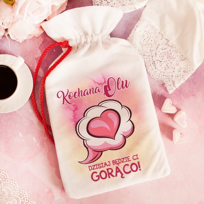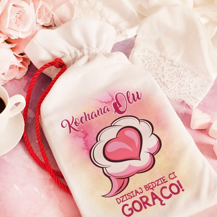 - Termofor znajduje się w uroczym kubraczku. Umieścimy na nim personalizację w postaci imienia Twojej ukochanej poprzedzonego słowem „ukochana”, a także napis: „dzisiaj będzie Ci gorąco”. Na kubraczku znajduje się też grafika przedstawiająca serce oraz chmurkę. Na białym tle materiału dominuje kolor różowy, który idealnie oddaje romantyczny charakter prezentu, ale też ukazuje miłość.