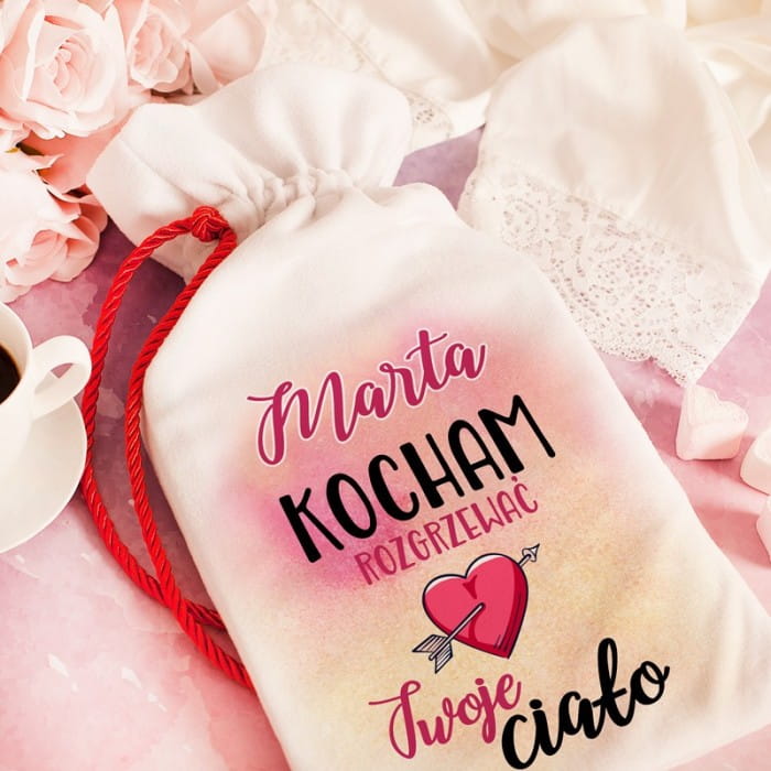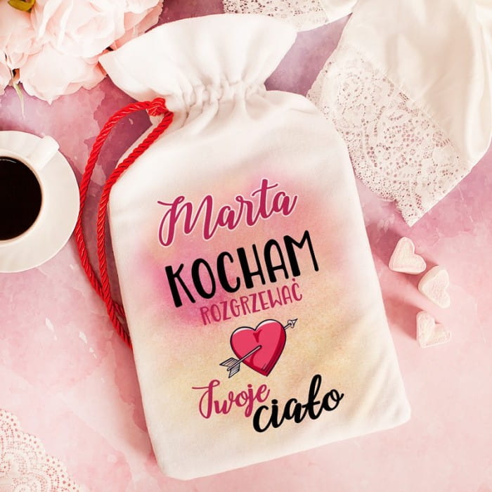 - Termofor w kubraczku jest wykonany z gumy i posiada zaworek. Można go napełniać gorącą wodą i służy do ogrzewania ciała. Świetnie sprawdza się w przypadku wszelkich dolegliwości bólowych. Termofor jest zapakowany w materiałowy kubraczek, który uzupełnimy o grafikę. Będzie na nim widniało imię Twojej ukochanej, a także napis: Kocham rozgrzewać Twoje ciało. Ponadto znajdzie się na nim serce przebite strzałą. Termofor w kubraczku jest poręczny, a woreczek, w który jest zapakowany można zwęzić przy użyciu sznurka znajdującego się w górnej części.