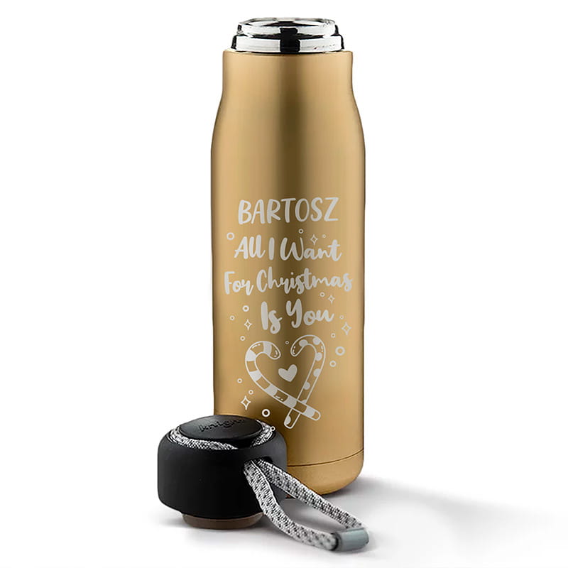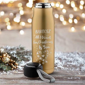 Złoty personalizowany termos świąteczny to wyjątkowy prezent dla bliskiej naszemu sercu osoby. Romantyczny nadruk „All I want for Christmas is you” oraz możliwość dodania imienia sprawiają, że jest to oryginalny upominek. Świetnie sprawdzi się jako drobny, ale osobisty gest miłości w świątecznym czasie.