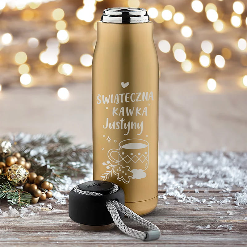 Butelka termiczna ma elegancki, złoty kolor z matowym wykończeniem, co nadaje jej stylowego charakteru. Przednia część termosu ozdobiona jest białym nadrukiem przedstawiającym filiżankę z gorącym napojem, pierniczki oraz świąteczne detale. Na nadruku znajduje się miejsce na imię, co czyni ten termos z personalizacją na święta produktem unikatowym. Wykonany z wysokiej jakości stali nierdzewnej, wyposażony w szczelną zakrętkę z uchwytem, dobrze sprawdza się w codziennym użytkowaniu. Termoizolacja pozwala na utrzymanie temperatury napoju przez wiele godzin – bez względu na warunki pogodowe.