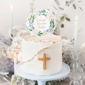 Dekoracyjny topper na tort z napisem Pierwsza Komunia Święta to efektowny dodatek do wypieków przygotowanych na uroczystość komunijną. Ozdobny wianek z zielonych liści i drobnych kwiatów w pastelowych kolorach tworzy subtelną ramę dla złotego napisu. Topper komunijny na tort podkreśla charakter uroczystości i dopełnia wizualną oprawę słodkiego stołu.