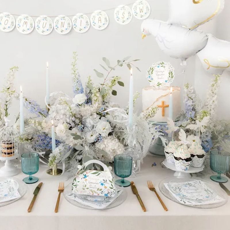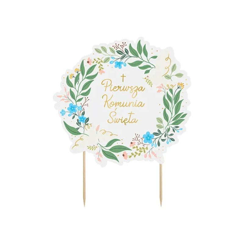 Topper wykonany jest z lekkiej tektury i umieszczony na dwóch drewnianych patyczkach, co zapewnia stabilność oraz łatwość w umieszczeniu na cieście. Centralny punkt stanowi napis w ozdobnym kroju pisma, otoczony roślinnym wieńcem z zielonych liści i kwiatów w pastelowych odcieniach – niebieskich, różowych i białych. Forma wycinana jest precyzyjnie wzdłuż konturu dekoracji, dzięki czemu topper wygląda estetycznie z każdej strony. Topper komunijny na ciasto jest produktem jednorazowego użytku, przeznaczonym do bezpośredniego kontaktu z wypiekami.