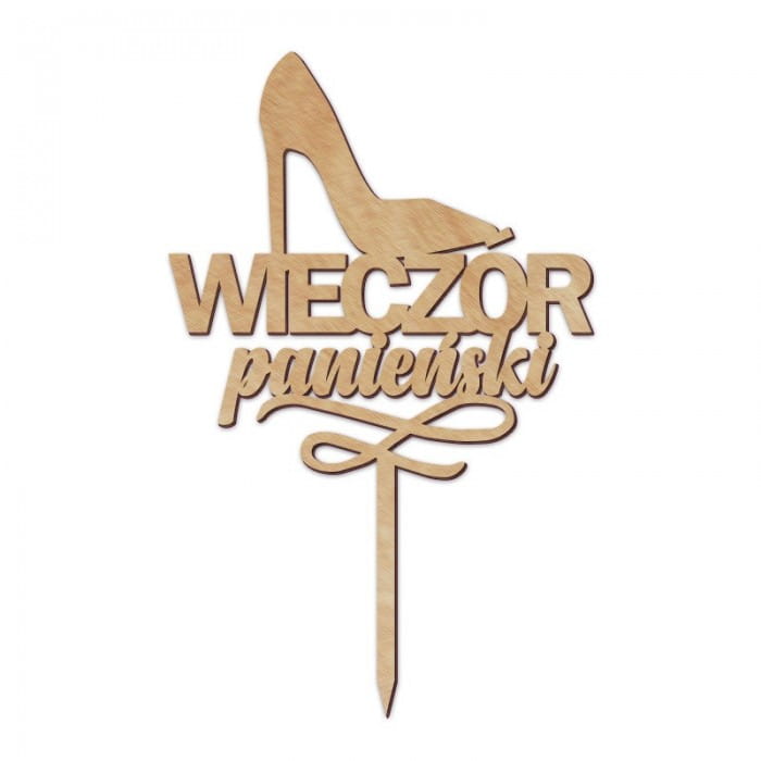 - Drewniany topper na tort na powierzchnię wypieku z łatwością można umieścić, ponieważ wyposażony jest w dwie nóżki z zaostrzonymi końcówkami. Topper ma jasny kolor, w naturalnym odcieniu drewna. Napis na topperze Wieczór Panieński dopełnia kobiecy akcent w kształcie pantofla na wysokim obcasie.
