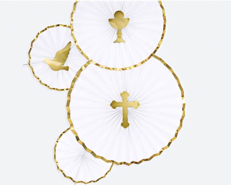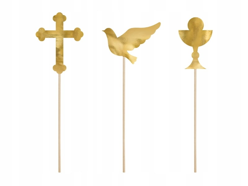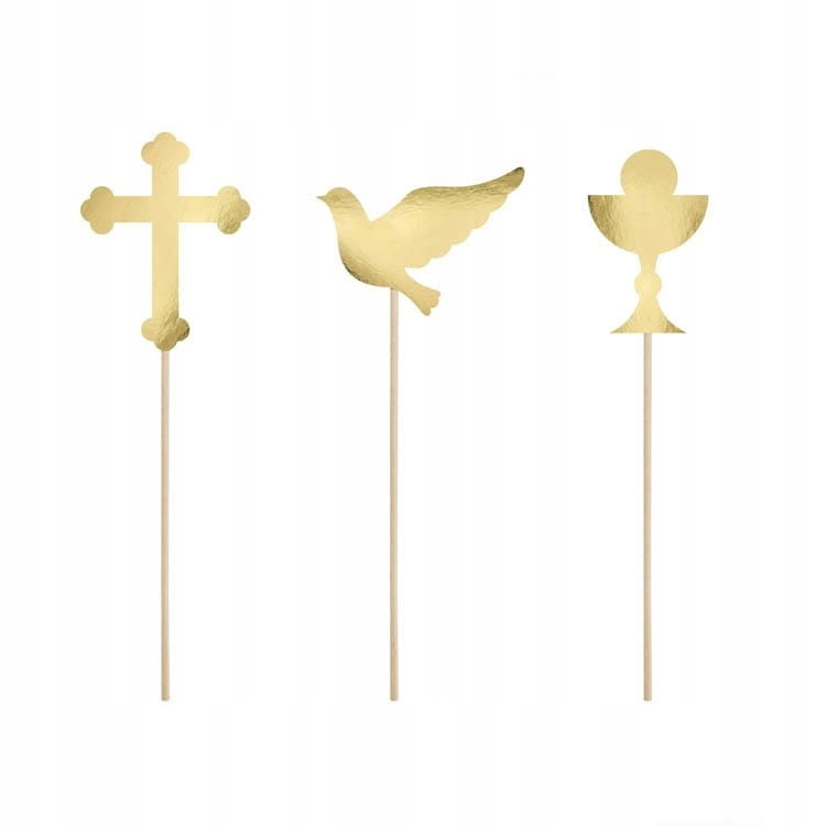 Złote toppery komunijne do dekoracji tortu i ciast podkreślą charakter uroczystości Pierwszej Komunii Świętej. Symboliczne kształty – krzyż, kielich i gołębica – nawiązują do duchowego wymiaru wydarzenia. Komplet zawiera 6 sztuk lekkich, eleganckich dekoracji, które uzupełnią słodki stół i wprowadzą spójną estetykę do aranżacji komunijnego przyjęcia.