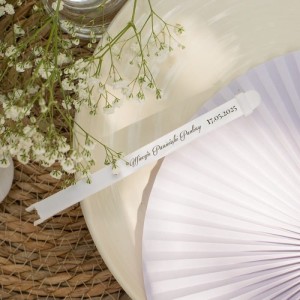 - W wersji złożonej wachlarz wygląda jak podłużne białe etui, który ozdabia napis. Po rozłożeniu staje się praktycznym gadżetem do wachlowania, zwłaszcza w upalne, letnie dni.