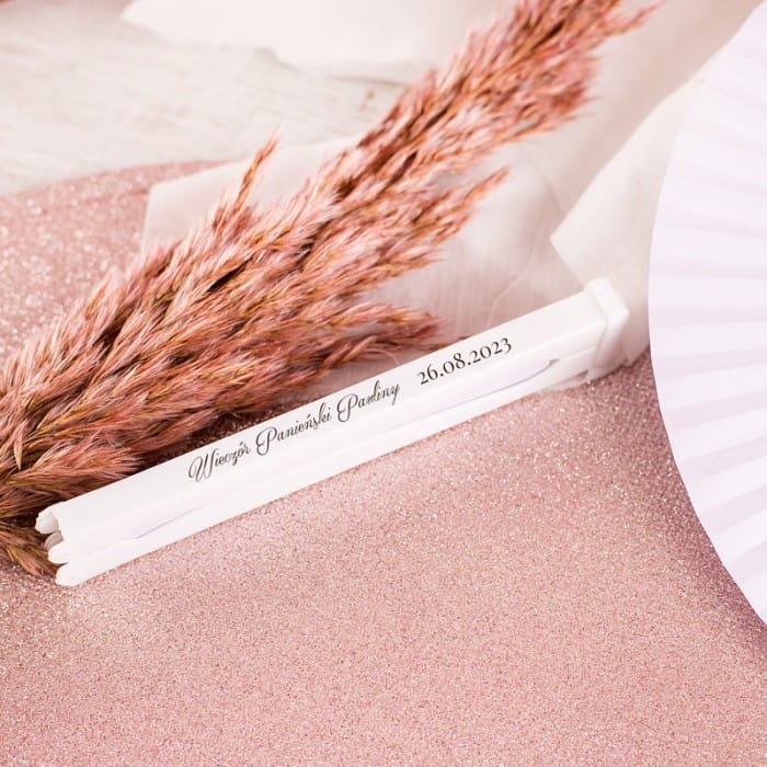 - Wachlarz ma klasyczny kształt, czyli składa się z papierowej części wyciętej na kształt koła, złożonej w harmonijkę. Część do wachlowania osadzona jest na białym uchwycie, dzięki któremu można swobodnie korzystać z gadżetu. Na białej rączce znajduje się grawerowany napis dedykacyjny Wieczór panieński, który wzbogacimy o personalizację, czyli imię przyszłej panny młodej oraz datę imprezy.