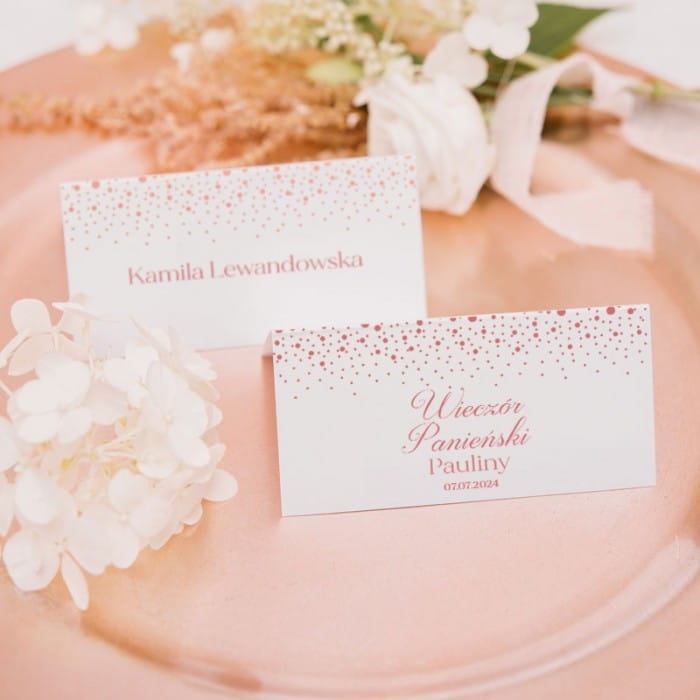 Subtelne rozpryski koloru na każdej kartce tworzą efektowny, ale nie przytłaczający wzór, który doskonale współgra z delikatnymi kwiatowymi aranżacjami i subtelnymi elementami dekoracyjnymi. Co więcej, połyskujący nadruk jest odporny na rozmazywanie, co gwarantuje trwałość tych winietek. Wykonane z grubszej kartki, winietki zachowują swój kształt przez całe przyjęcie, stając się nie tylko elementem organizacyjnym, ale także cenną pamiątką dla gości. Każde imię jest wydrukowane z dbałością o szczegóły, nadając winietkom osobisty charakter na stole.