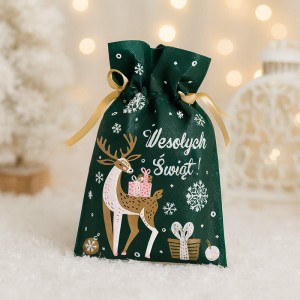Świąteczny worek prezentowy w kolorze głębokiej zieleni z uroczą grafiką renifera i napisem Wesołych Świąt to praktyczne i stylowe rozwiązanie na zapakowanie prezentu bożonarodzeniowego. Worek posiada wygodne zamknięcie na satynowe wstążki. To ekologiczna i estetyczna alternatywa dla papierowego opakowania.