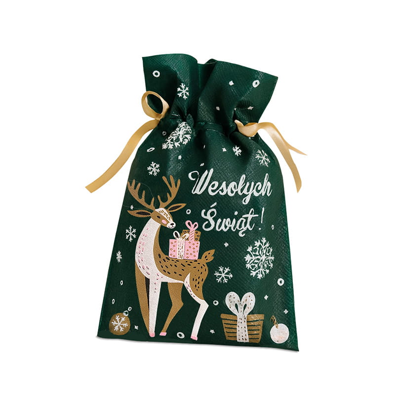 Worek został wykonany z trwałego materiału w kolorze butelkowej zieleni. Przód ozdobiony jest dużą, kolorową ilustracją renifera niosącego prezenty, otoczoną śnieżynkami, gwiazdkami i świątecznymi dekoracjami. Nadruk został wykonany w wysokiej jakości, dzięki czemu kolory są intensywne, a detale wyraźne. U góry worek ściągany jest delikatną, złotą wstążką, która nie tylko pełni funkcję zamknięcia, ale stanowi też dekoracyjny akcent.