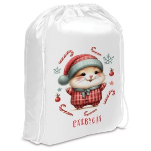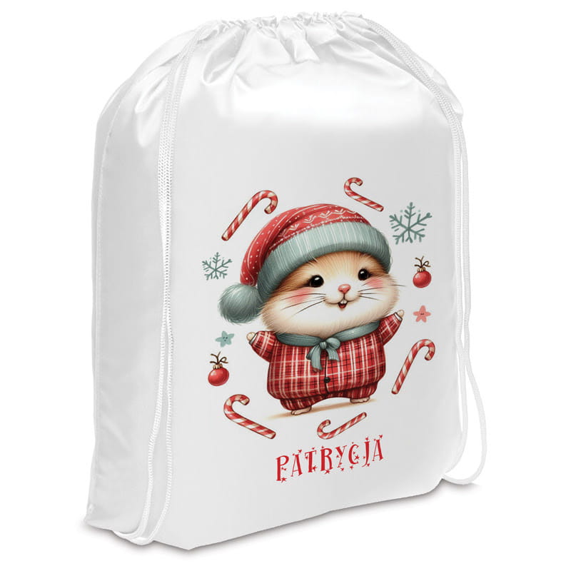 Personalizowany worek na prezenty od świętego Mikołaja to opakowanie stworzone specjalnie dla dzieci oczekujących prezentów na święta. Ilustracja zimowego zwierzaka w piżamce otoczona cukrowymi laskami i śnieżynkami idealnie oddaje klimat Bożego Narodzenia. Taki worek to świetna alternatywa dla tradycyjnego pakowania prezentów pod choinkę na wigilię.