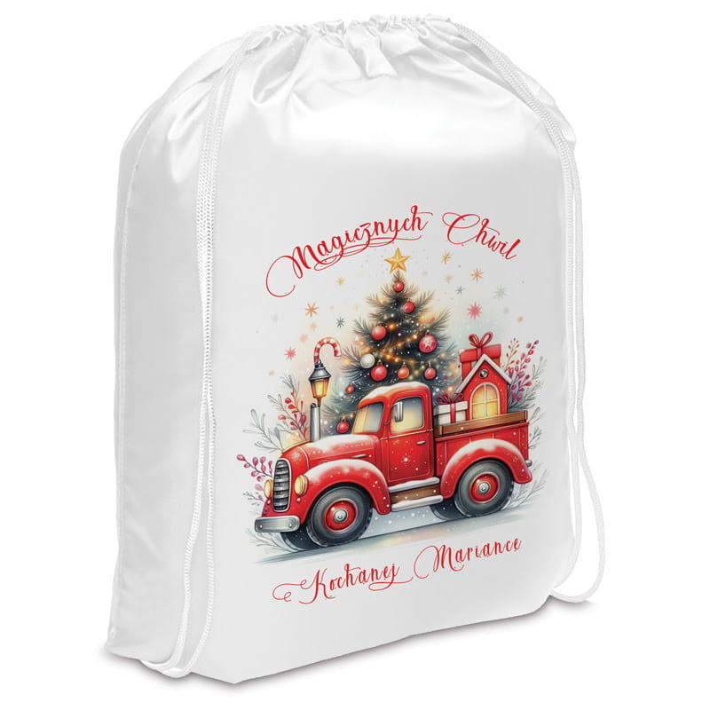 Wizualnie produkt zachwyca kolorową, bogatą grafiką. Na białym tle umieszczono czerwony samochód ciężarowy w stylu retro, przewożący prezenty i świąteczny domek. W tle widać udekorowaną choinkę i śnieżynki. Nad grafiką umieszczono napis „Magicznych chwil”, a pod nią - miejsce na imię dziecka. Worek jest zamykany na biały sznurek.
