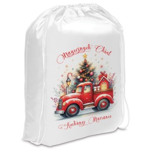 Personalizowany worek na prezenty z czerwonym samochodzikiem, choinką i napisem „Magicznych chwil” to doskonałe opakowanie dla dzieci czekających na święta, wigilię i prezenty od świętego Mikołaja. Wykonany z trwałego materiału, zachwyca bajkową grafiką w klimacie zimy i Bożego Narodzenia. Idealny na Mikołajki lub pod choinkę.