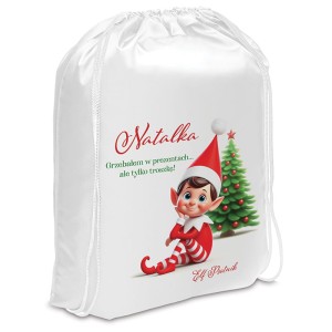 Wizualnie worek na prezenty wykonany jest z trwałego, śnieżnobiałego materiału przypominającego satynę. W centralnej części znajduje się kolorowy nadruk z elfem w czerwonym stroju, siedzącym pod świąteczną choinką. Na worku widnieje napis “Grzebałem w prezentach… ale tylko troszkę!”. Obok znajduje się miejsce na imię dziecka. Całość zamykana jest na biały, solidny sznurek, który pełni jednocześnie funkcję uchwytu oraz zabezpieczenia przed Elfem Psotnikiem (żeby już więcej nie grzebał).