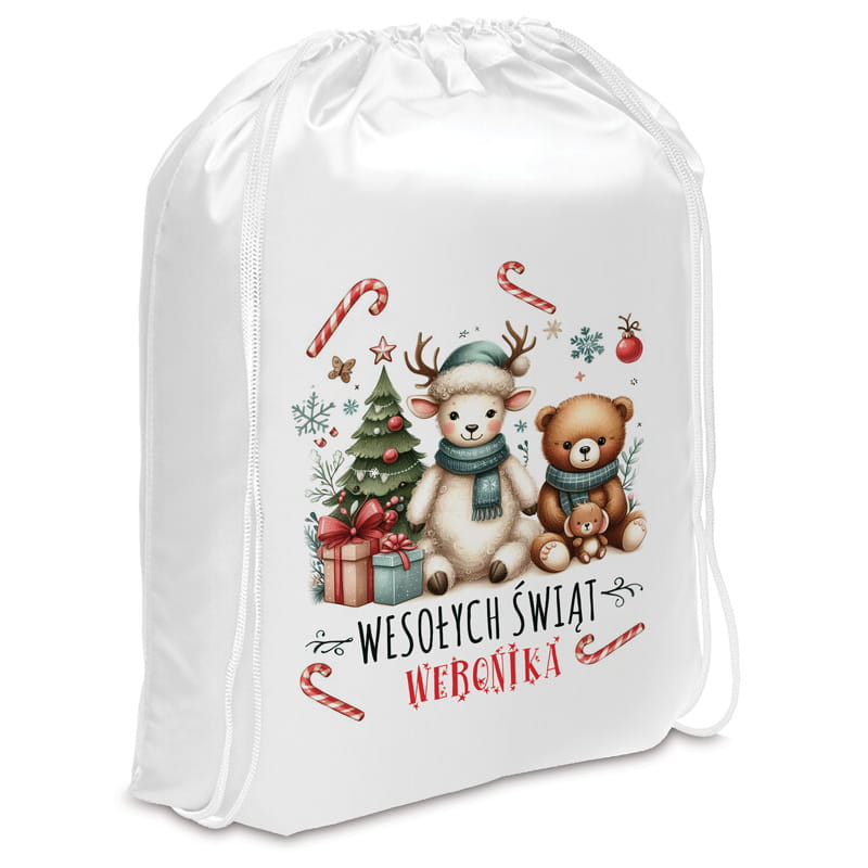 Produkt został wykonany z białego materiału o delikatnym połysku, który świetnie eksponuje kolorowy nadruk. Centralnym punktem grafiki jest duet – pluszowy miś i renifer w zimowym szaliku – siedzący obok choinki i prezentów. Całość otoczona jest świątecznymi detalami: cukrowymi laskami, śnieżynkami i bombkami. Na górze nadrukowano napis „Wesołych Świąt”, a pod spodem – miejsce na personalizację imieniem dziecka. Worek na prezenty zamykany jest na biały sznurek, który pełni również funkcję uchwytu.