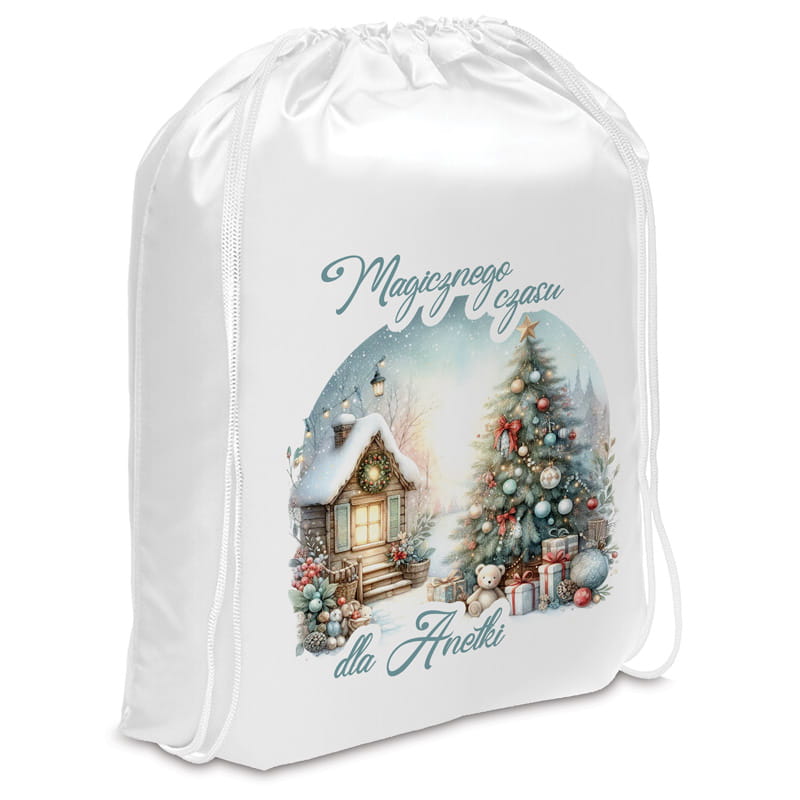 Wykonany z białego, połyskującego materiału worek na prezenty prezentuje się elegancko i wytrzymale. Na froncie znajduje się pełna detali ilustracja – ośnieżony domek z zapalonymi światłami, bogato zdobiona choinka, prezenty i świąteczne ozdoby. Całość uzupełnia napis „Magicznego Czasu” oraz miejsce na personalizację imieniem dziecka. Kompozycja utrzymana jest w delikatnych, zimowych barwach z akcentami czerwieni i złota. Worek zamykany jest za pomocą białego sznurka.
