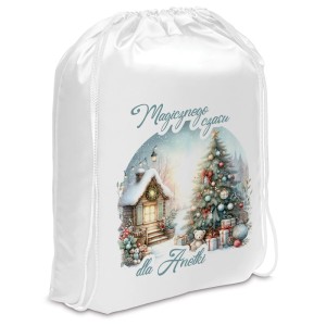 Biały worek na prezenty z piękną, zimową grafiką i personalizacją to doskonałe opakowanie dla dzieci czekających na podarunki od świętego Mikołaja. Ilustracja przedstawiająca choinkę, domek i świąteczne dekoracje buduje magiczny nastrój Bożego Narodzenia. Worek jest idealny na wigilię żeby rozdać z niego prezenty świąteczne.