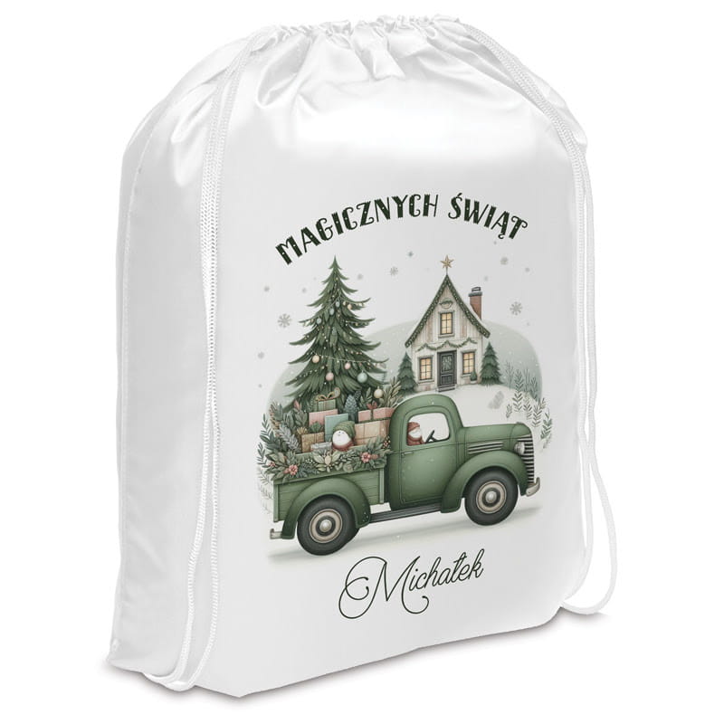 Worek wykonany z trwałego, białego materiału o lekkim połysku, ozdobiony został dużym nadrukiem przedstawiającym zieloną ciężarówkę, która wiezie prezenty i choinkę, a w tle znajduje się świąteczny domek otulony śniegiem. Na górze nadrukowano napis „Magicznych Świąt”, a pod grafiką – personalizowane imię dziecka. Worek zamykany jest na biały, solidny sznurek, co pozwala łatwo zabezpieczyć zawartość.