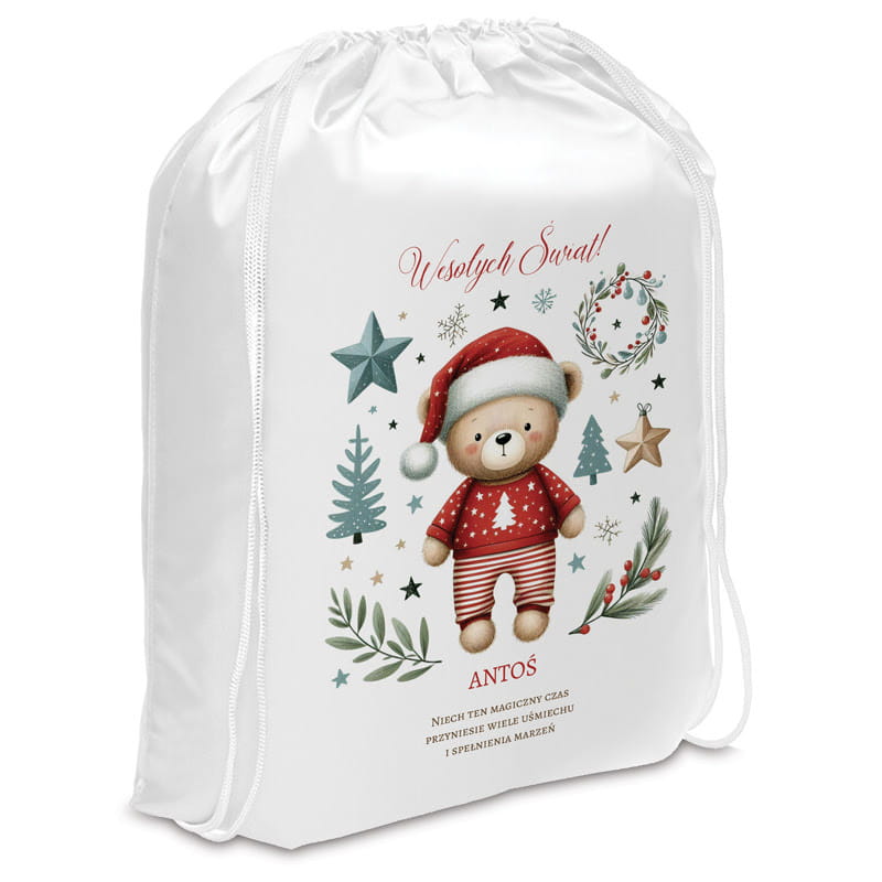 Produkt wykonano z białego materiału o delikatnym połysku. Z przodu umieszczono grafikę uroczego misia w świątecznej piżamce i czapce Mikołaja, otoczonego bożonarodzeniowymi ozdobami: gwiazdkami, wieńcem, gałązkami i śnieżynkami. Powyżej grafiki widnieje napis „Wesołych Świąt!”, a poniżej znajduje się miejsce na imię oraz krótka, świąteczna dedykacja. Worek ściągany jest białym sznurkiem, co umożliwia łatwe i estetyczne zamknięcie.