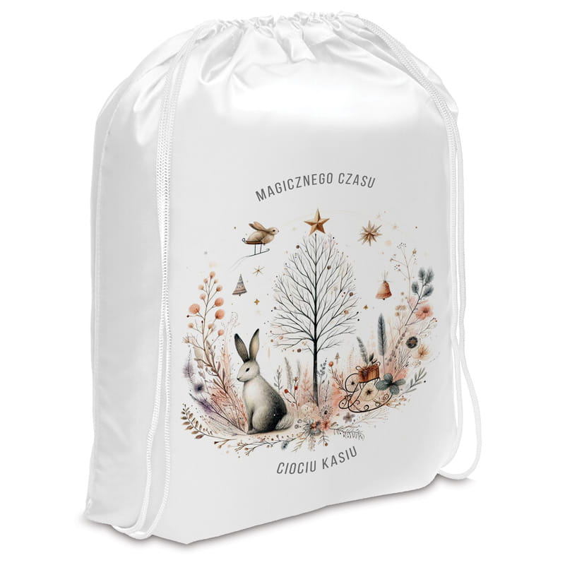 Ten elegancki worek na prezenty z zimową ilustracją i możliwością personalizacji to wyjątkowy sposób na zapakowanie świątecznych podarunków. Delikatna grafika z zającem, drzewkiem i leśnymi motywami sprawia, że produkt zachwyci zarówno dzieci, jak i dorosłych. Idealny na święta, wigilię i prezenty od świętego Mikołaja. Niezastąpiony podczas Bożego Narodzenia w magicznej, zimowej oprawie.