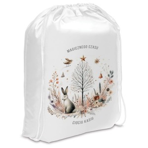 Wizualnie produkt wykonany został z białego materiału, który pięknie połyskuje w świetle. Na środku znajduje się grafika przedstawiająca zająca, choinkę i drobne zimowe akcenty, takie jak gałązki, szyszki, prezenty, gwiazdy i sanie. Ilustracja utrzymana jest w delikatnych, naturalnych kolorach. U góry nadrukowano napis "MAGICZNEGO CZASU", a u dołu – miejsce na personalizowany podpis. Całość zamykana jest na biały sznurek, który nie tylko zabezpiecza zawartość, ale pełni również funkcję uchwytu.