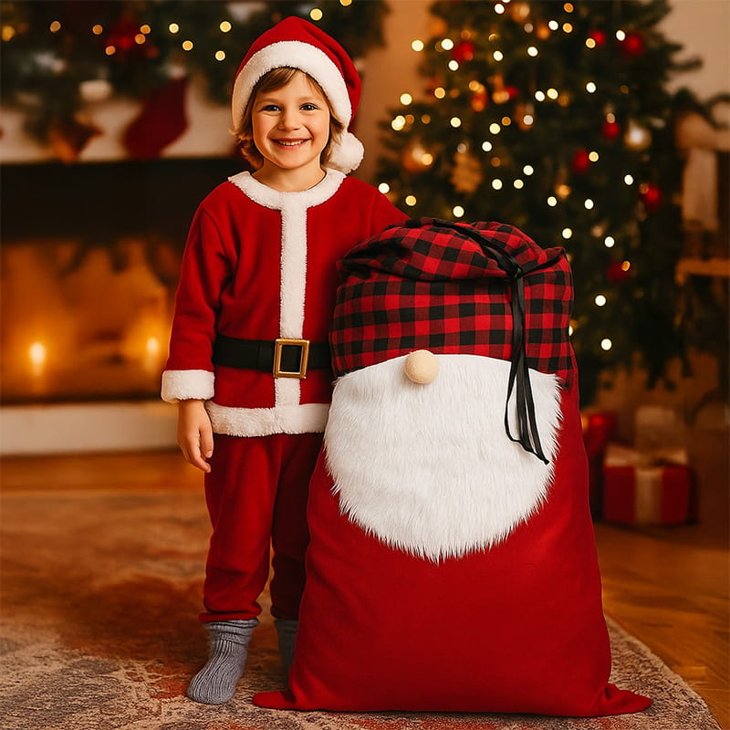 Duży, miękki worek świąteczny XXL dla dzieci z motywem skrzata to doskonały sposób na zapakowanie prezentów w oryginalny i magiczny sposób. Świąteczna kolorystyka, futerkowa broda i uroczy nosek nadają mu wyjątkowego uroku. Pojemność pozwala na zmieszczenie nawet kilku większych upominków. To nie tylko praktyczne opakowanie, ale też część świątecznej dekoracji.