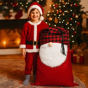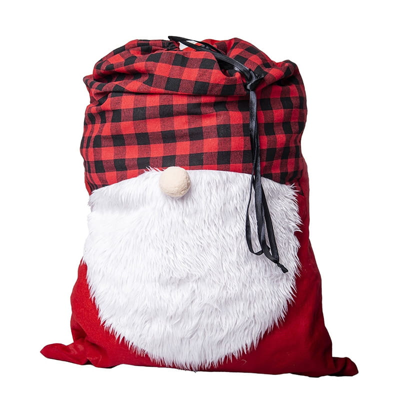 Wizualnie worek prezentuje się bardzo efektownie. Górna część utrzymana jest w klasycznym czerwono-czarnym wzorze w kratę, przypominającym czapkę skrzata. Środkową część zdobi miękka, biała, futerkowa broda, a jej centralnym punktem jest beżowy nosek wykonany z materiałowej kulki. Dolna część to intensywna czerwień – typowa dla bożonarodzeniowych dekoracji. Całość ściągana jest czarną wstążką, która pozwala łatwo zamknąć worek i zabezpieczyć zawartość.