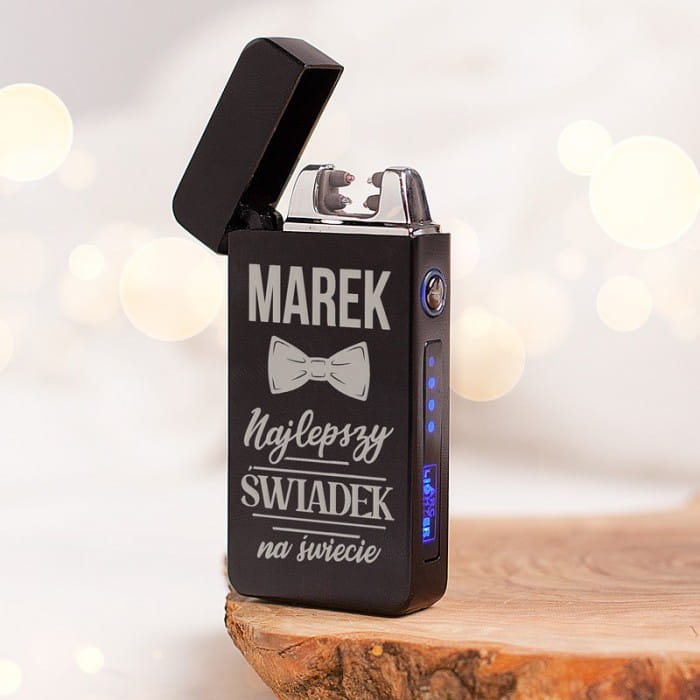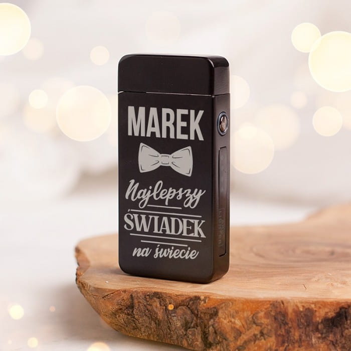 - Na metalowej obudowie zapalniczki uzupełnieniem walorów technicznych jest jej wygląd, na który składa się grawer z dedykacją dla świadka. Na pierwszy plan wysuwa się oczywiście napis o największych rozmiarach, czyli imię świadka. Tuż pod personalizacją znajduje się symbol męskiej elegancji, czyli mucha, uwieńczeniem całej grawerowanej kompozycji jest dopisek: