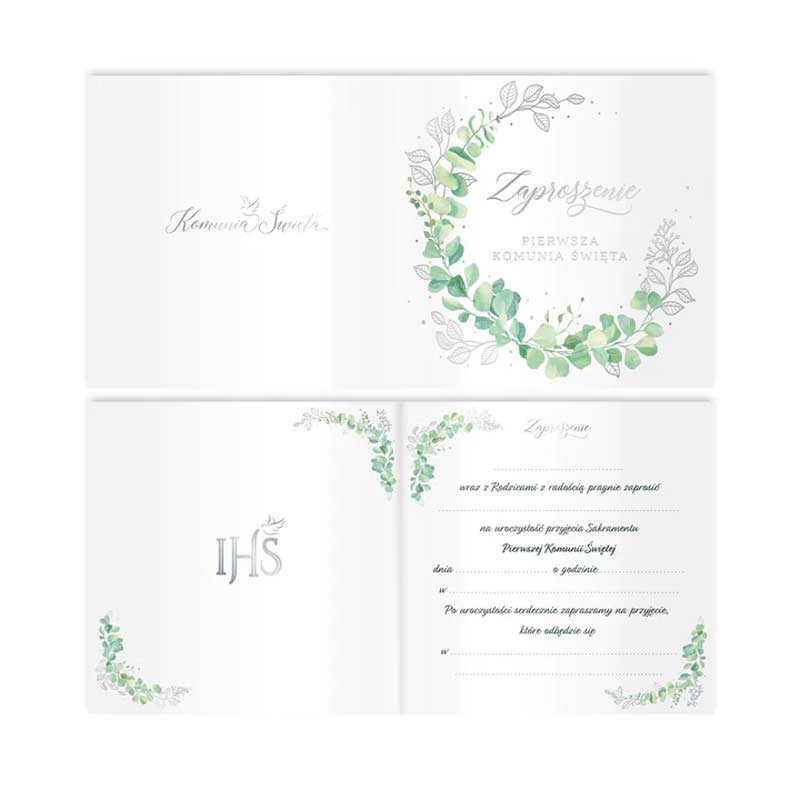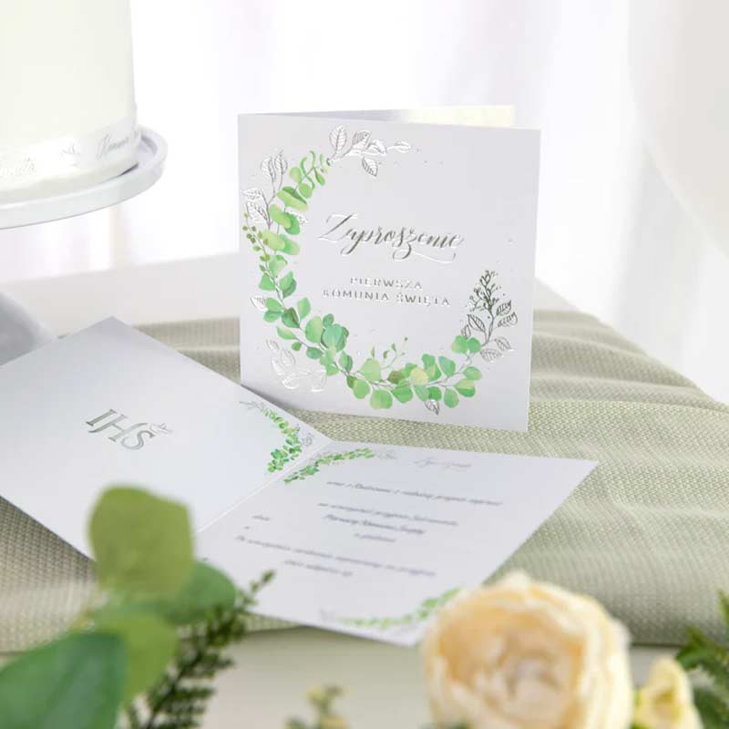 Uniwersalne zaproszenie na Pierwszą Komunię Świętą dziecka zostało zaprojektowane w eleganckim, minimalistycznym stylu. Okładka zdobiona jest zielono-srebrnym motywem roślinnym, który tworzy delikatny wieniec wokół stylizowanego napisu „Zaproszenie”. Dodatkowo srebrne tłoczenia subtelnie odbijają światło, nadając zaproszeniu wyrafinowanego wyglądu. Biały, wysokiej jakości papier doskonale współgra z całością, tworząc harmonijną kompozycję. Wnętrze zaproszenia zawiera przejrzysty, gotowy do uzupełnienia tekst, który pozwala na łatwe wpisanie wszystkich najważniejszych informacji. Znajdują się tam pola na imię dziecka, datę i godzinę mszy świętej oraz miejsce przyjęcia. Ponadto dodatkowe zdobienia w postaci srebrnych elementów nadają całości wyjątkowy charakter. Dzięki składanej formie zaproszenie jest wygodne w użytkowaniu, a dołączona biała koperta pozwala na eleganckie wręczenie gościom lub wysłanie pocztą.