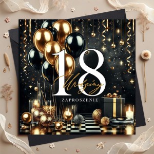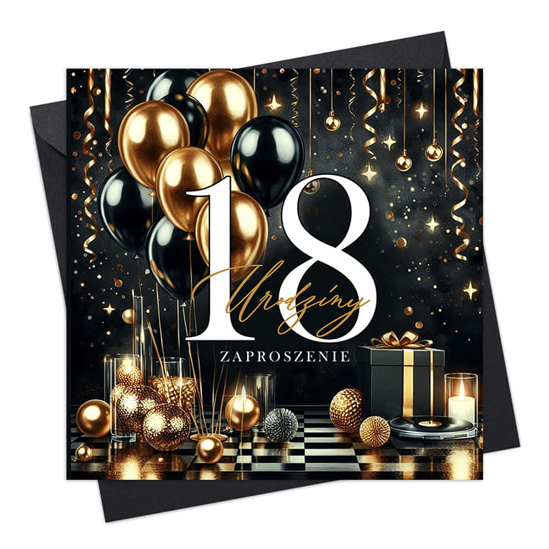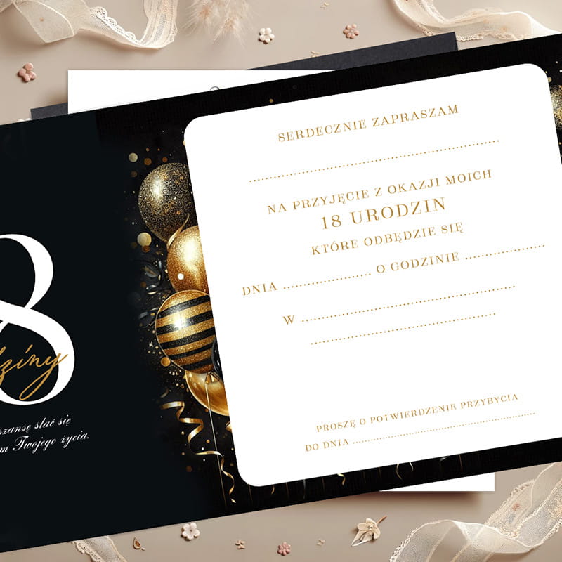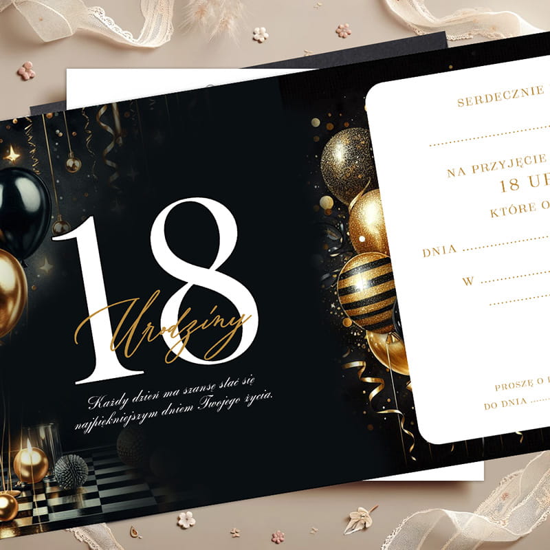 Zaproszenia na 18 urodziny w czarno-złotej kolorystyce to elegancka i efektowna oprawa wyjątkowego wejścia w dorosłość. Kontrast głębokiej czerni i matowego złota nadaje całości stylu glamour, idealny na stylową, wieczorną imprezę urodzinową.
