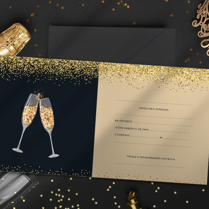 - W zestawie znajduje się 10 sztuk zaproszeń oraz tyle samo białych kopert w dopasowanym rozmiarze. Zaproszenia prezentują się wyjątkowo efektownie, utrzymane w kolorystyce czerni z elementami złotymi. Ta kombinacja barw nadaje im luksusowego i eleganckiego wyglądu, idealnie pasującego do okazji. Zaproszenia są gotowe do samodzielnego uzupełnienia informacji odnośnie przyjęcia, co daje możliwość personalizacji treści i dostosowania ich do konkretnej imprezy. Wnętrze również jest ozdobione kreatywną grafiką.