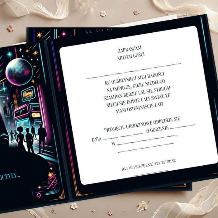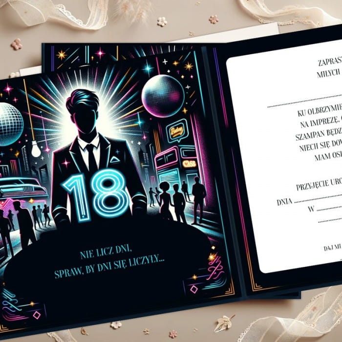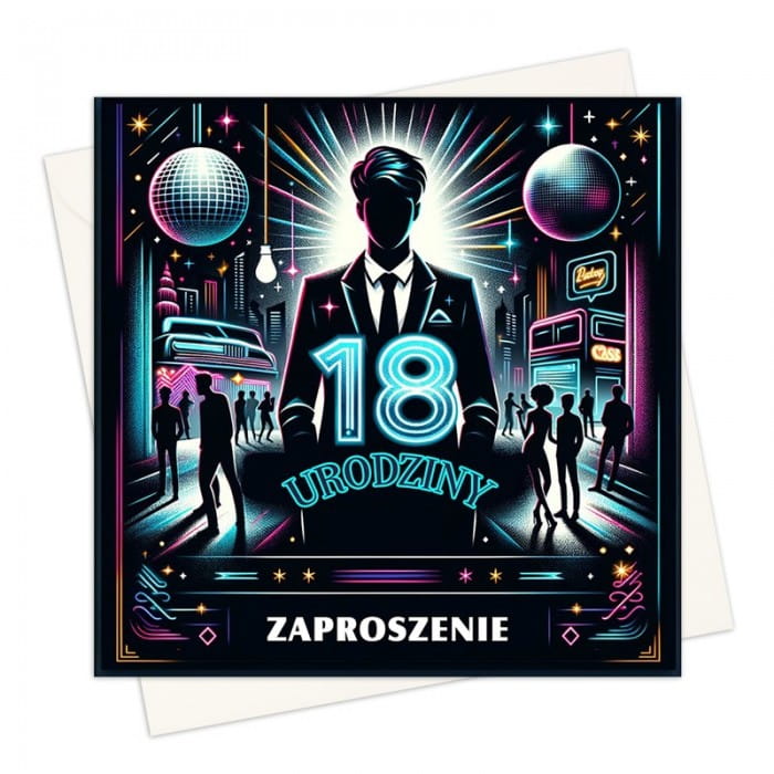 Komplet zaproszeń na osiemnastkę dla młodego mężczyzny to połączenie miejskiego stylu z energią kolorowych neonów. Zaprojektowano je tak, aby na pierwszy rzut oka przyciągnąć uwagę dynamicznymi grafikami. Motywy, takie jak błyszczące kule dyskotekowe i sylwetki ludzi w tańcu, nadają imprezowej atmosfery. W centrum znajduje się postać chłopaka w garniturze. Po środku znajduje się hasło "18 URODZINY" oraz "ZAPROSZENIE". Tekst nadrukowano intensywnymi barwami, zapowiadając niezapomniane wydarzenie. Zróżnicowana kolorystyka i gra światła nadają temu zaproszeniu nowoczesności.