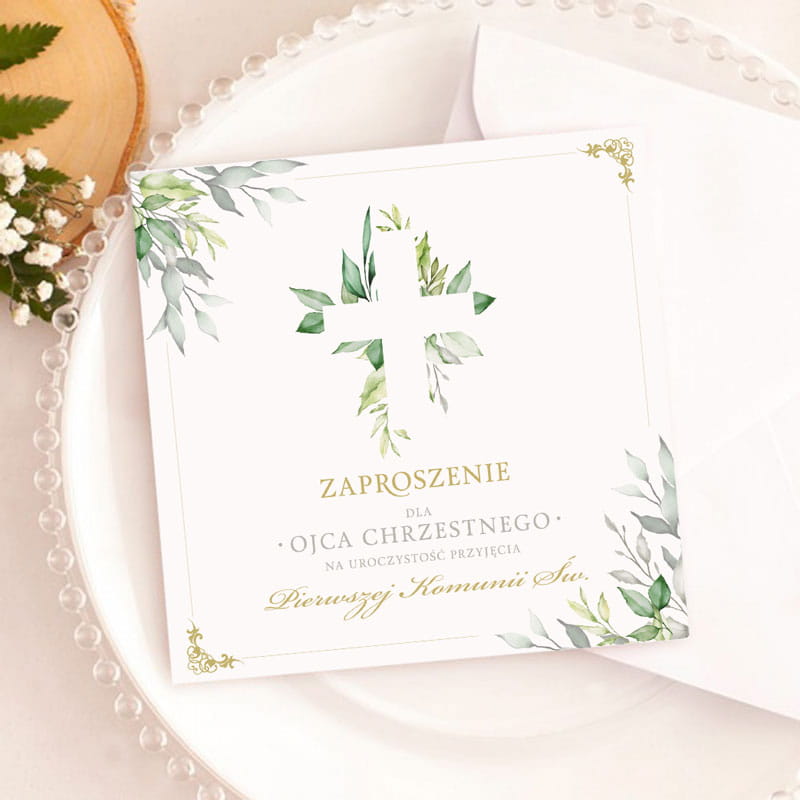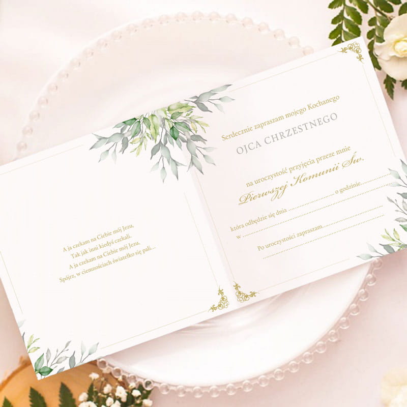 Zaproszenie na pierwszą komunię świętą wykonane jest z wysokiej jakości papieru o delikatnej fakturze, co nadaje mu elegancki wygląd. Na okładce znajduje się subtelny motyw zielonych liści otaczających symboliczny krzyż. Złote zdobienia dodają elegancji, a stylowa typografia nadaje zaproszeniu dostojnego charakteru. Tekst „Zaproszenie dla Matki Chrzestnej” lub „Zaproszenie dla Ojca Chrzestnego” podkreśla wyjątkową relację z adresatem. Wnętrze zaproszenia zostało zaprojektowane z myślą o uroczystym charakterze Pierwszej Komunii Świętej. Po lewej stronie znajduje się wzruszający cytat podkreślający duchowy wymiar wydarzenia. Po prawej stronie umieszczono personalizowany tekst zaproszenia, który można dostosować, wpisując imię dziecka, datę, godzinę oraz miejsce uroczystości. Delikatne listki wkomponowane w projekt dodają całości spójnego wyglądu.
