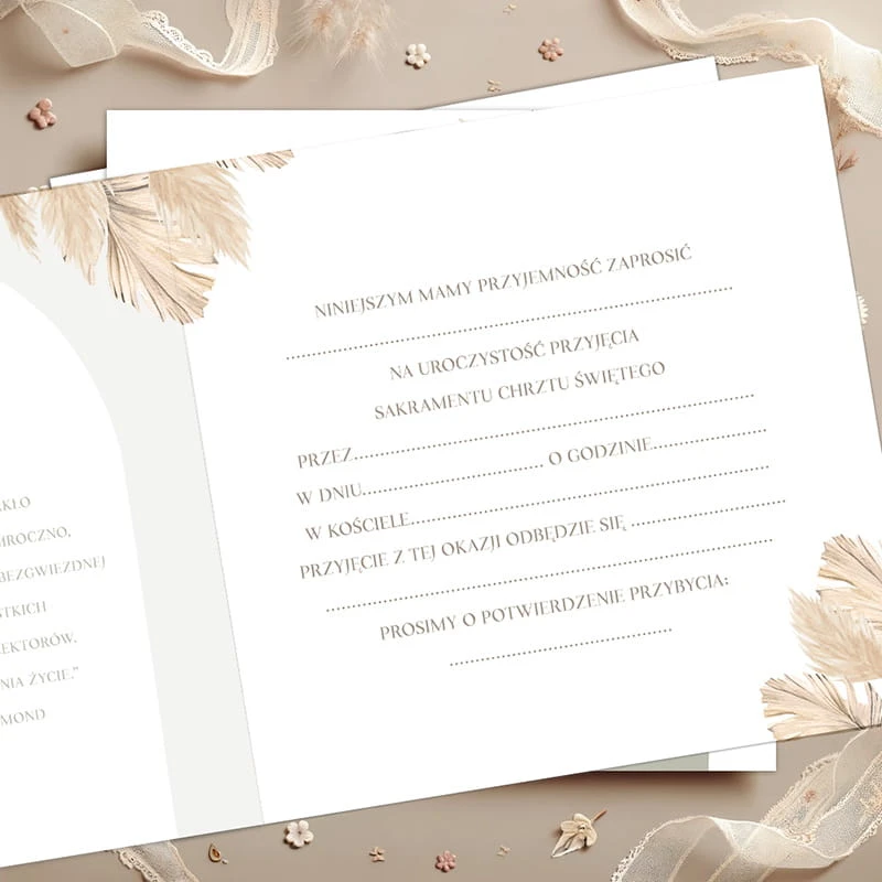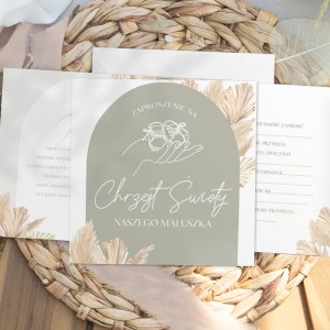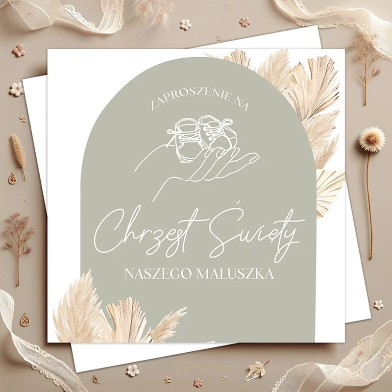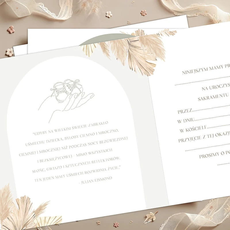 Zaproszenia utrzymane są w modnym, naturalnym stylu - z motywem roślinnym i stonowaną paletą barw, które doskonale wpisują się w klimat chrztu. Na okładce znajduje się napis „Zaproszenie na Chrzest Święty naszego maluszka” oraz subtelna grafika dłoni trzymającej dziecięce buciki. Wewnątrz umieszczono gotowy tekst do uzupełnienia, dzięki czemu przygotowanie zaproszeń jest szybkie i wygodne.