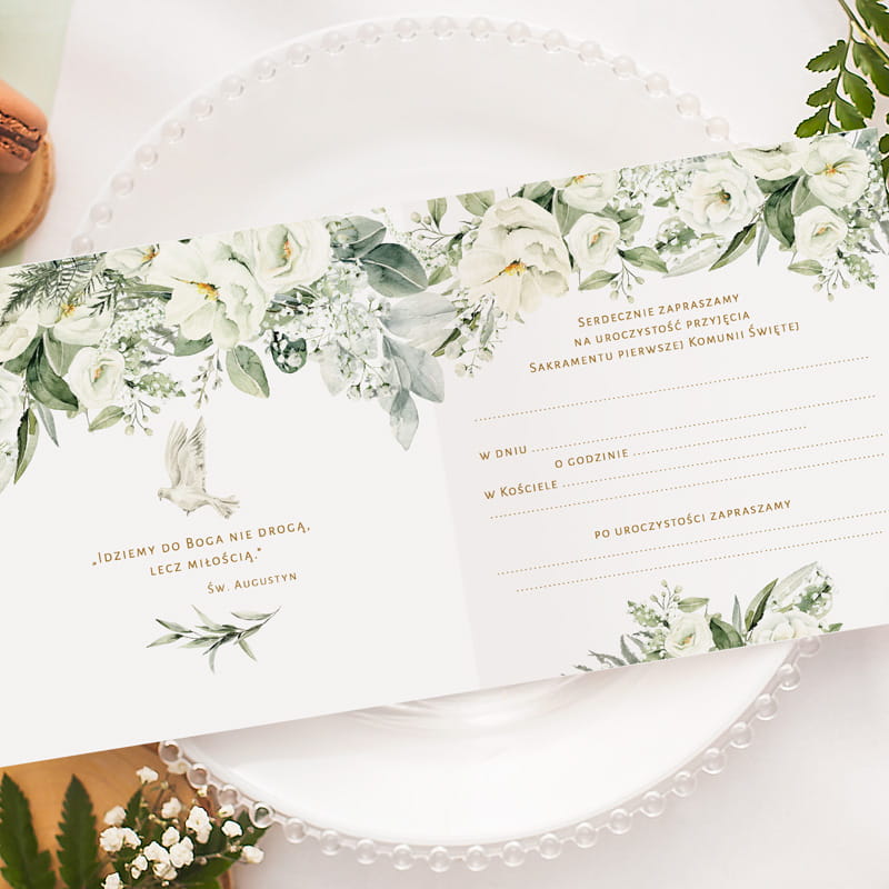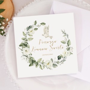 Uniwersalne zaproszenie na Pierwszą Komunię Świętą dziecka wyróżnia się minimalistycznym, ale niezwykle eleganckim wyglądem. Na okładce znajduje się subtelna grafika gołębicy otoczonej wieńcem z białych kwiatów i zielonych liści. Całość utrzymana jest w jasnej kolorystyce, która podkreśla duchowy wymiar uroczystości. Dodatkowo złocone litery nadają zaproszeniu klasyczny charakter i sprawiają, że prezentuje się niezwykle stylowo.