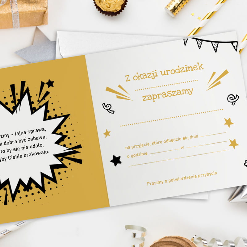 Na okładce znajduje się rysunkowy bohater przypominający Batmana, w charakterystycznym czarnym stroju i pelerynie. Obok niego umieszczono komiksowe dymki, gwiazdki oraz napis "Zaproszenie na Urodzinki". Wnętrze kartki zawiera dwustronny projekt – po lewej stronie umieszczono komiksowy tekst a po prawej przestrzeń do uzupełnienia: kto zaprasza, kiedy i o której odbywa się przyjęcie. Wszystko to utrzymane w stylu graficznym inspirowanym komiksem. Komplet obejmuje 10 składanych zaproszeń na urodziny.