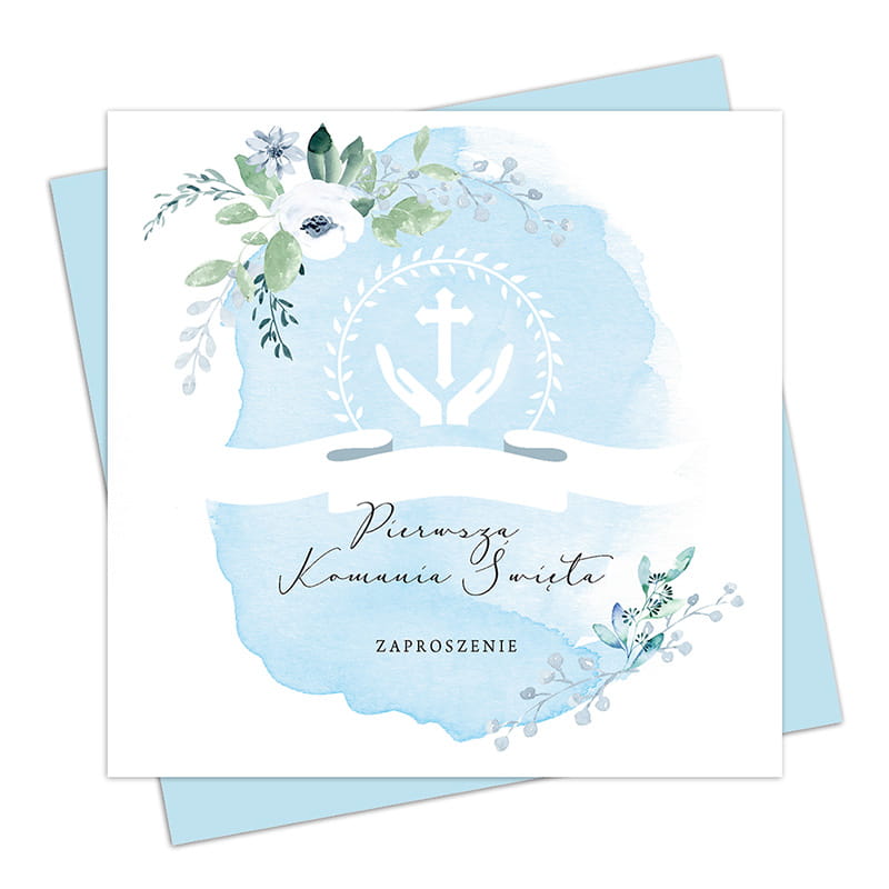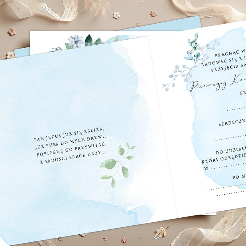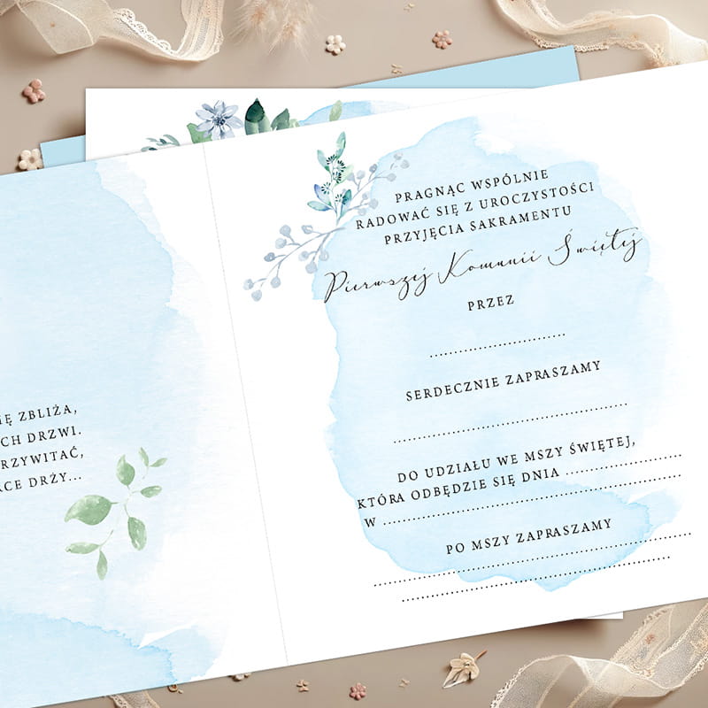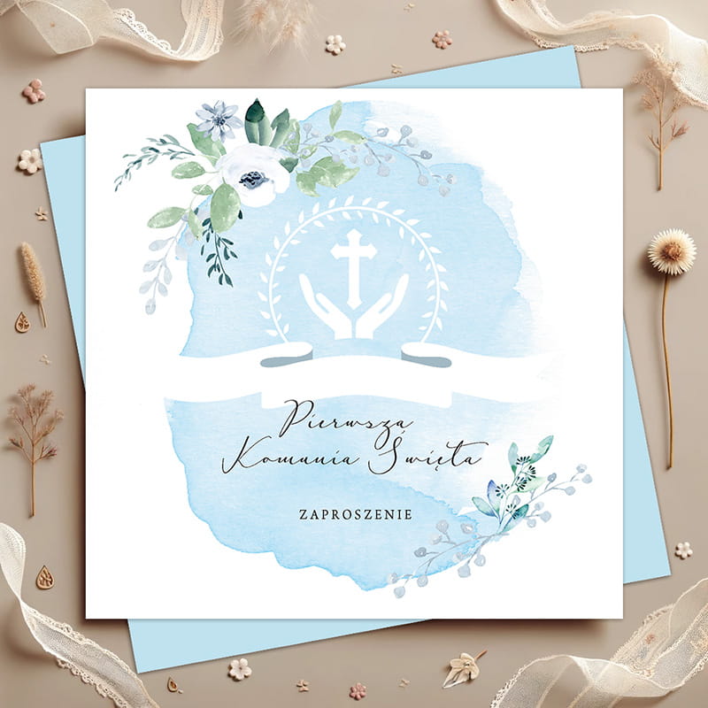 Zaproszenia utrzymane są w jasnej kolorystyce z subtelnym, błękitnym tłem przypominającym akwarelową plamę. Całość ozdobiona jest delikatnymi gałązkami i kwiatowymi elementami, które nadają projektowi elegancji i lekkości. W centralnej części znajduje się symbol krzyża oraz napis „Pierwsza Komunia Święta”, a harmonijna kompozycja sprawia, że zaproszenia prezentują się bardzo stylowo.