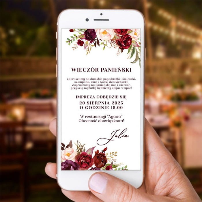 - Elektroniczne zaproszenie na wieczór panieński ma postać specjalnie zaprojektowanego pliku graficznego, który po zakupie otrzymasz od nas drogą mailową. Tekst zaproszenia możesz wymyślić sama — załącz zredagowaną treść zaproszenia podczas składania zamówienia, a my umieścimy ją na grafice. Zdaj się na swoją kreatywność — im bardziej nietuzinkowy będzie tekst na zaproszeniu, tym większe wrażenie zrobi na gościach! Nasze elektroniczne zaproszenie na wieczór panieński zdobi modna grafika z motywem kwiatowym, który podkreśla kobiecy charakter spotkania. Taka forma zaproszenia z pewnością pozytywnie zaskoczy wszystkie dziewczyny. Wygoda, szybkość, personalizacja, ekologia i estetyczny wygląd zaproszeń elektronicznych sprawiają, że stanowią one znakomitą alternatywę dla tradycyjnych zaproszeń papierowych i przypadną do gustu fanom nowoczesnych i prostych rozwiązań.
