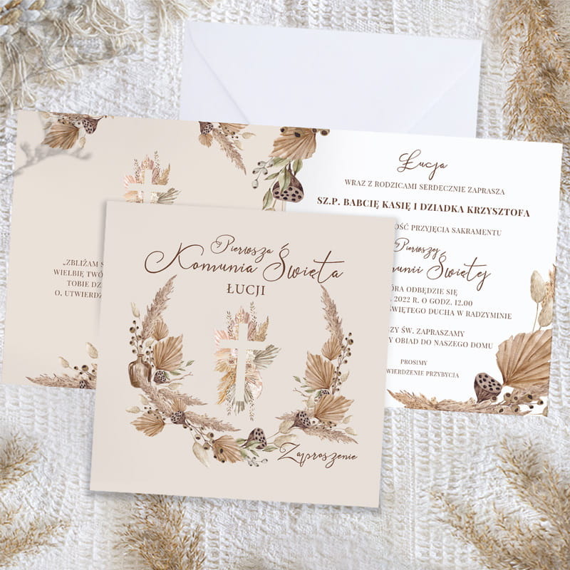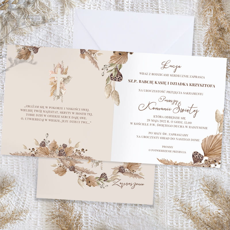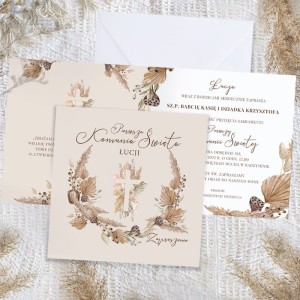 Personalizowane zaproszenie na komunię wyróżnia się wyjątkową kompozycją barw i detali. Na okładce dominuje beżowe tło z subtelnym, ręcznie ilustrowanym motywem boho – suszone trawy, delikatne kwiaty i liście otaczają centralnie umieszczony krzyż. Całość podkreślają eleganckie, stylizowane napisy w odcieniach ciepłego brązu, nadające kompozycji delikatnego, ale jednocześnie podniosłego charakteru.