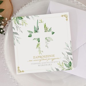 Pierwsza Komunia Święta to jeden z najważniejszych dni w życiu dziecka i jego rodziny. Taka okazja wymaga pięknej oprawy, a zaproszenie na pierwszą komunię świętą to sposób, by w elegancki i wyjątkowy sposób zaprosić bliskich na to wydarzenie. Stylowy projekt z motywem zielonych liści sprawia, że zaproszenie doskonale wpisuje się w aktualne trendy i podkreśla uroczysty charakter ceremonii.