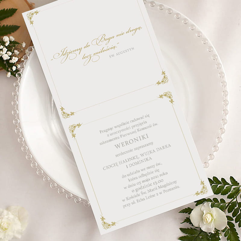 Każdy detal tego zaproszenia został zaprojektowany tak, by oddać podniosły charakter Pierwszej Komunii Świętej. Staranne złote zdobienia, subtelne zielone liście i klasyczna typografia tworzą harmonijną całość. Dzięki personalizacji treści można stworzyć unikalne zaproszenie, które w elegancki sposób poinformuje gości o tej ważnej uroczystości.