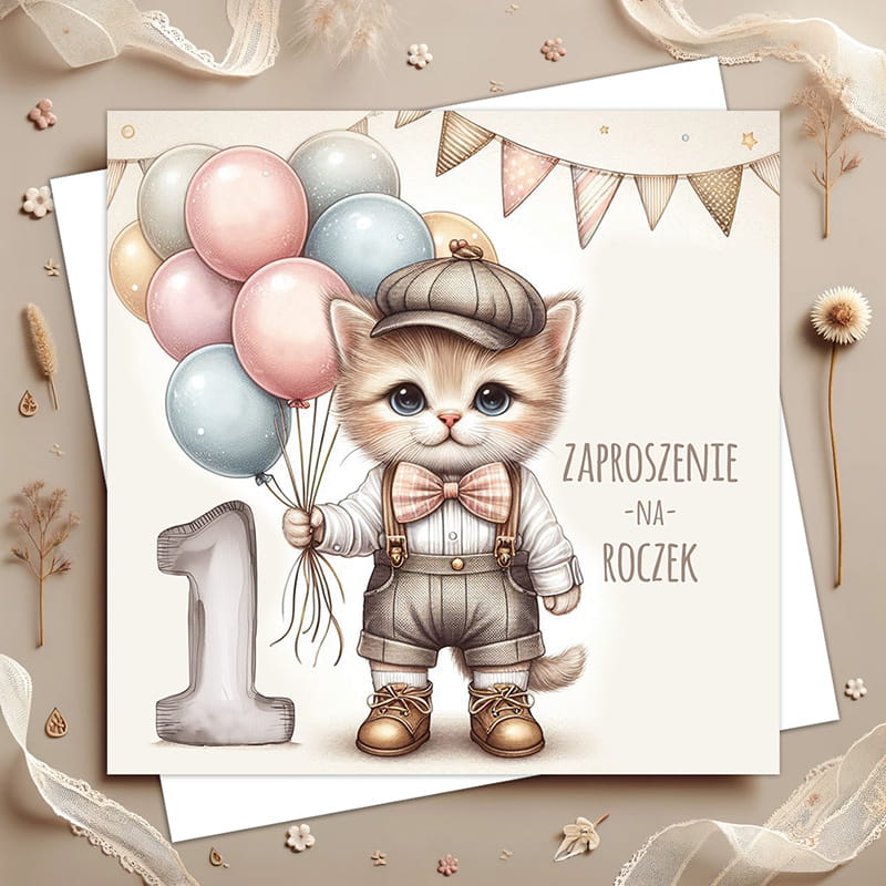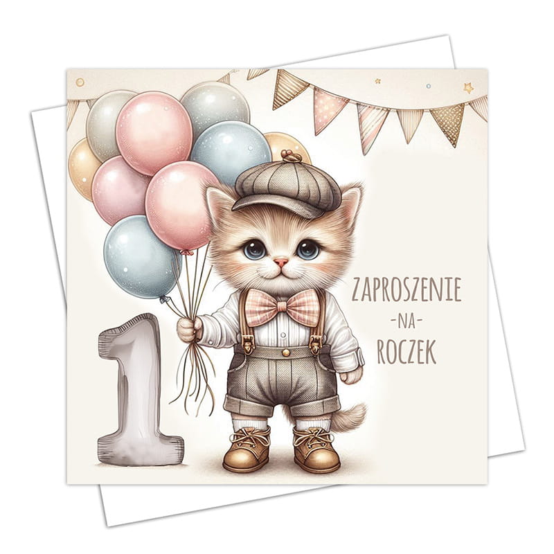 Zaproszenie to kwadratowa kartka o delikatnym kremowym tle, z przodu ozdobiona ilustracją słodkiego kotka ubranego w muszkę, szelki i kaszkiet. Obok widnieje liczba „1” oraz pastelowe balony, a nad nimi proporczyki tworzące urodzinową dekorację. Wnętrze zaproszenia na roczek zawiera dwie części – po lewej znajduje się uroczy, rymowany wierszyk podkreślający wyjątkowy moment pierwszych urodzin, po prawej natomiast przejrzysty formularz do samodzielnego wypisania danych: imienia gościa, daty, godziny oraz miejsca przyjęcia. Komplet zawiera 10 zaproszeń oraz koperty.