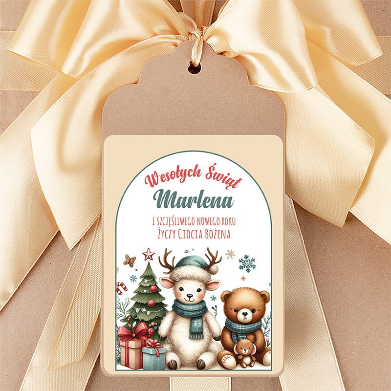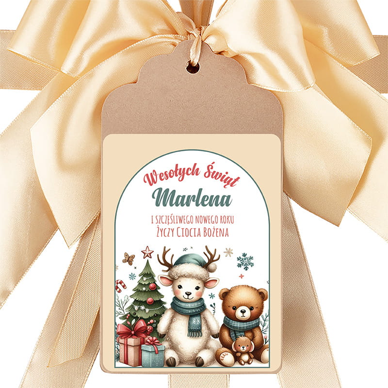 Zawieszka utrzymana w pastelowej, dziecięcej stylistyce, przedstawia sympatyczne zwierzątka w zimowej scenerii – misia, renifera i świąteczne drzewko w otoczeniu prezentów. Grafika została nadrukowana na sztywnym papierze, co gwarantuje trwałość i estetyczny wygląd. Centralna część przeznaczona jest na personalizację – imię dziecka oraz podpis osoby wręczającej prezent.