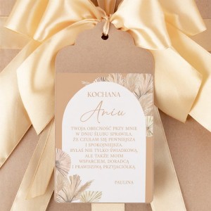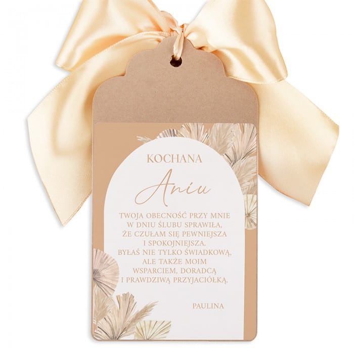 Tekst przekazuje emocje i uczucia, które trudno wyrazić słowami. Wykonana z wysokiej jakości materiału, zawieszka jest zarówno trwała, jak i estetyczna. Jej stonowana kolorystyka oraz piękne grafiki, takie jak subtelne liście w naturalnych odcieniach, tworzą harmonijną całość, która podkreśla znaczenie Twojej relacji ze świadkową.