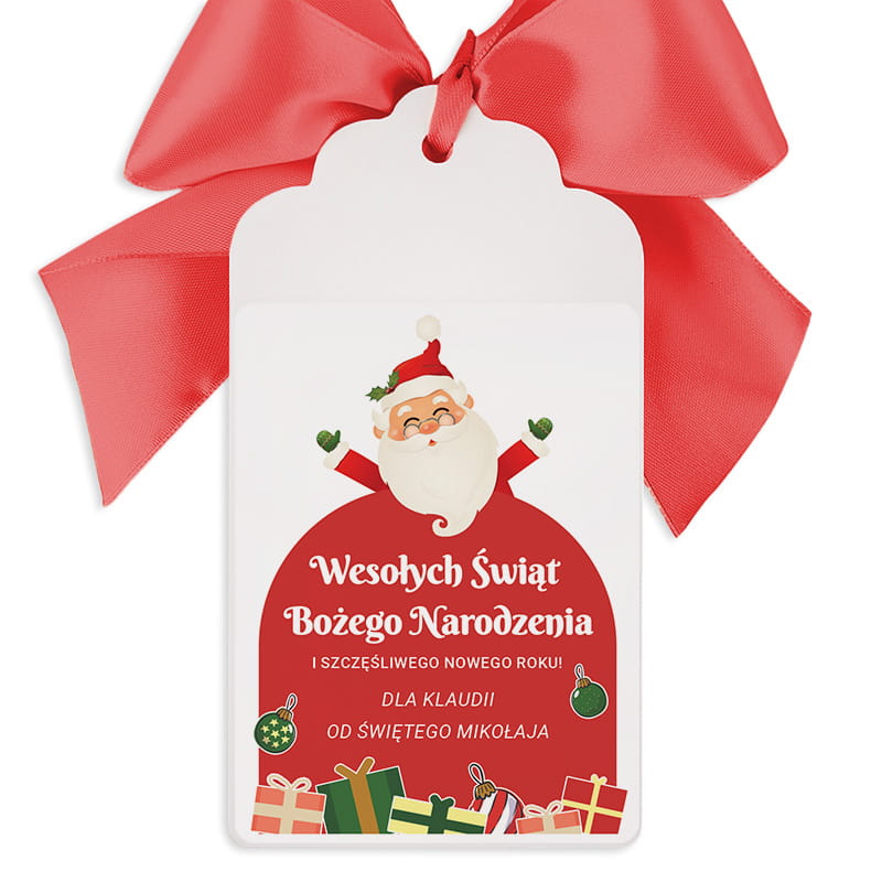 Personalizowana zawieszka to drobny, ale wyjątkowy dodatek do prezentu na Boże Narodzenie. Dzięki grafice z wesołym Świętym Mikołajem, ciepłym życzeniom i możliwości dodania imienia, każda paczka zyskuje indywidualny charakter. Idealna na święta, szczególnie dla dzieci. Piękna forma przekazu, która podkreśla magię wręczania prezentów w czasie Bożego Narodzenia.