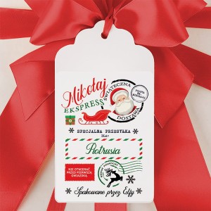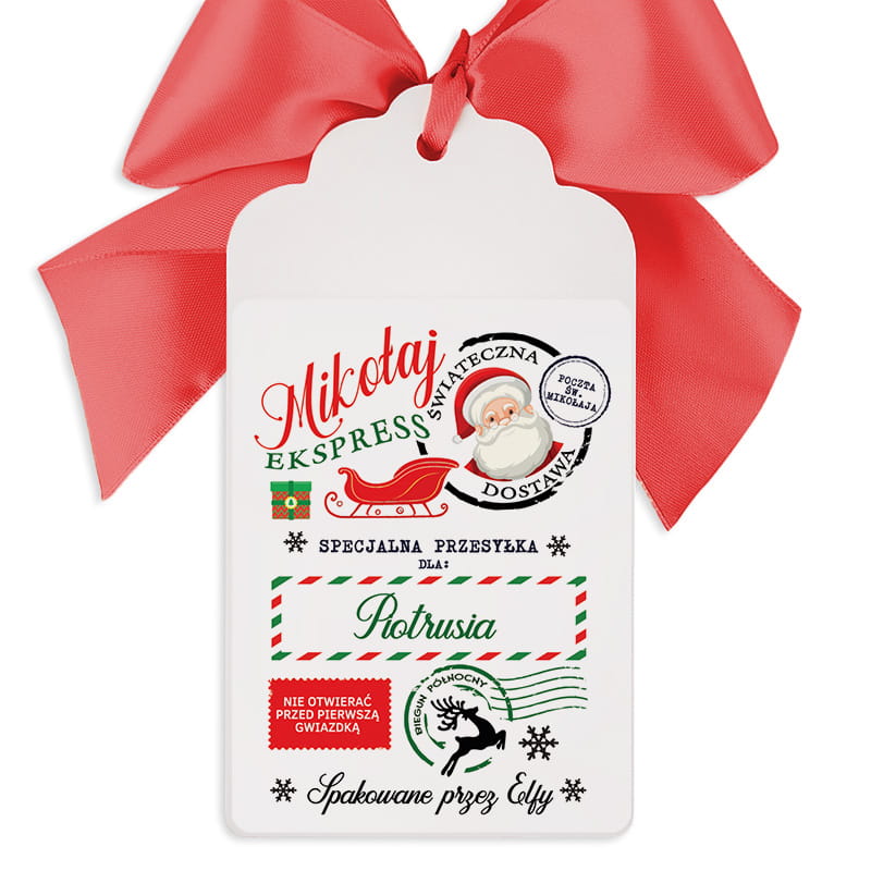 Zawieszka do prezentu przesyłka Mikołaja to zabawny i pomysłowy sposób na urozmaicenie opakowania świątecznego prezentu. Stylizowana na oficjalną etykietę nadawczą z „Poczty Świętego Mikołaja”, od razu przyciąga uwagę i wywołuje uśmiech. Święta to idealny moment, by wprowadzić magię do każdego szczegółu, a personalizacja zawieszki sprawia, że dziecko poczuje się naprawdę wyjątkowo. Taki drobny element tworzy klimat pełen emocji i wzmacnia wrażenia towarzyszące wręczaniu prezentów w czasie Bożego Narodzenia.