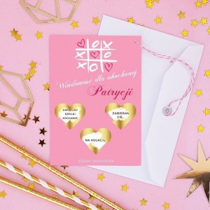 - Zdrapka personalizowana wiadomość dla Ukochanej jest dobrą alternatywą dla klasycznej kartki walentynkowej. Dzięki niej można pokazać duszę romantyka i zaskoczyć swoją partnerkę od najlepszej strony. Wykonana jest z materiału o wysokiej gramaturze. Do tego jest bardzo atrakcyjna wizualnie. Utrzymana jest w kolorze różowym, który jest metaforą zakochania się i „motylków w brzuchu”. Znajduje się na niej grafika przedstawiająca grę w kółko krzyżyk, tyle że oprócz nich znajdują się też serca. Nieco niżej umieścimy słowa: „wiadomość dla ukochanej” plus jej imię, a także trzy serduszka, pod którymi znajdą się owe wiadomości. Może to być deklaracja miłości, oświadczyny i np. deklaracja posprzątania kuchni. Od Ciebie zależy co będzie się skrywać pod zdrapkami.